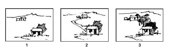 ภาพฝั่งซ้ายเส้นเป็นลักษณะโค้ง เช่น กะละมังที่ผู้หญิงนั่ง และตัวผู้ผญิงคนนี้ก้มลงเส้นขอบของลำตัวเป็นเส้นโค้ง เข้ากับกะละมังแต่ฝั่งขวามือเป็นโต๊ะมีลักษณะสี่เหลี่ยม ตัดกันกันกับวงกลมวิธีการคือการเชื่อมโยงรูปทรงของเรื่องราวให้เข้ากันด้วยการต่อเส้นโดยการเอาแปรงมาวางต่อระหว่างวงกลมกับโต๊ะให้เป็นเรื่องราวเดียวกัน